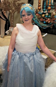 A couple of weeks ago my fabulous hair stylist invited me to be her hair model for the Christmas Open House at her salon. I was quite honored, because she has many clients who could model her talents (including other clients who also have uniquely-colored hair). Her vision for the event was to go with a snow queen theme, and so I was dressed accordingly.